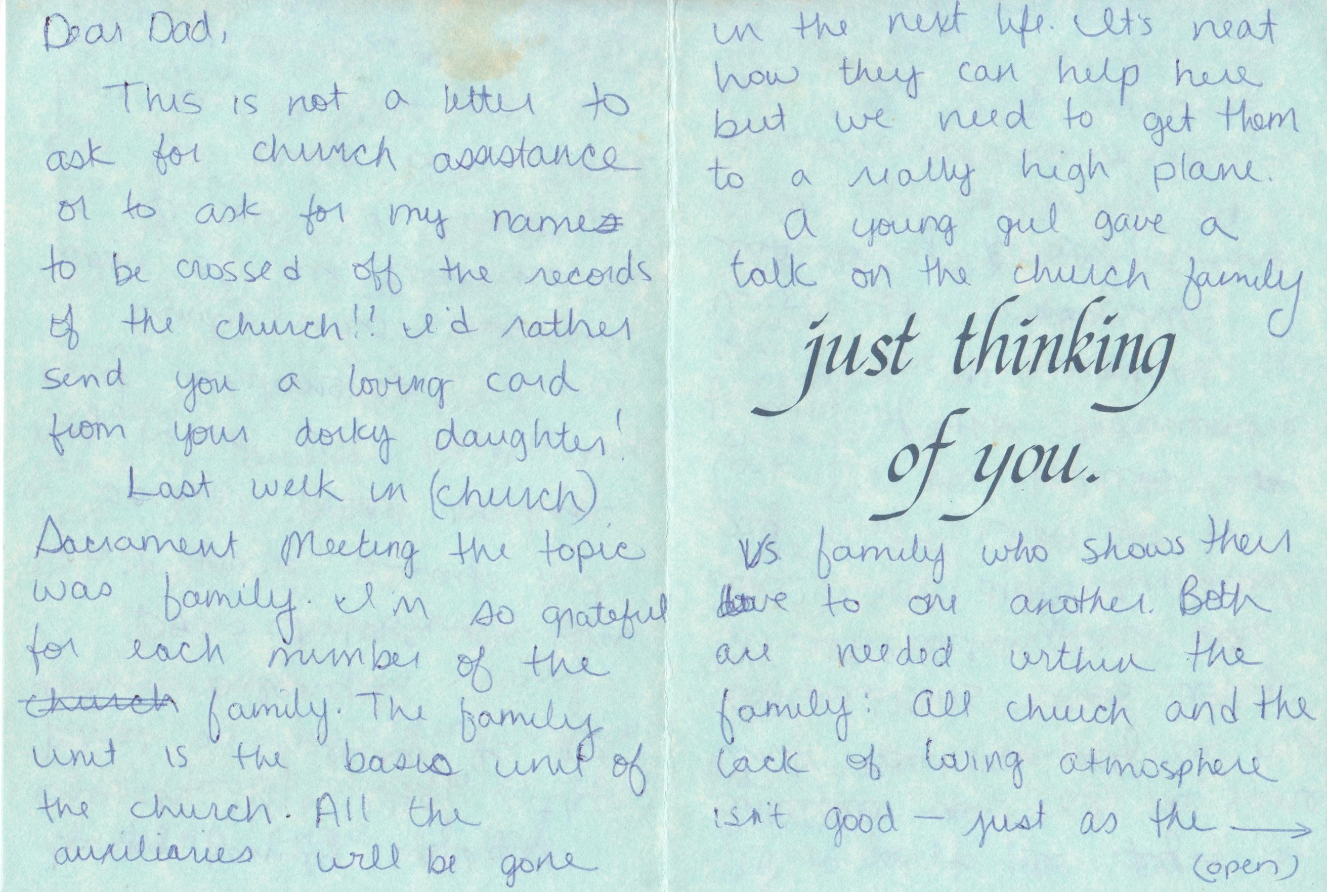 I am a very tender-hearted guy. My emotions come readily to the front on many occasions. One emotional moment the tears flow in reading a very special story, talking about Phyllis or singing some special song. A very special evening was when Phyllis had died and I went to bed and could not sleep. I went into David’s room and he loved me. I don’t remember praying then, but I’m sure I was blessed and comforted by the Holy Ghost through my son. He is always there to help me still. So is Russell. They are such a strength to me.