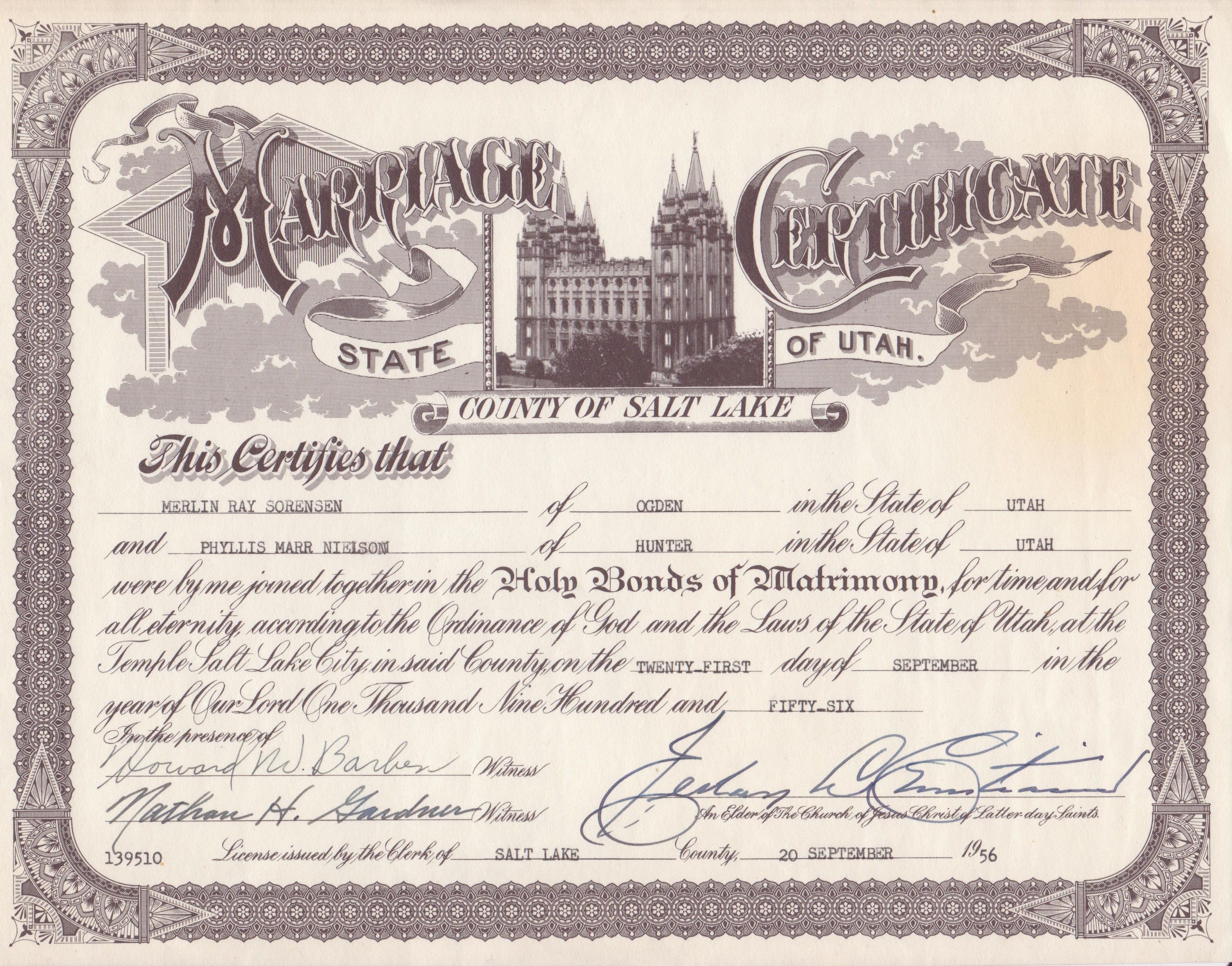 The wedding at the Salt Lake Temple was great, but I was nervous, scared, but happy! Since it was in the temple at Salt Lake City, I felt assured that it was right! Bishop Gardner and Howard Barben were our witnesses and the whole family was there, except my brother, Ferrell. It upset me but he didn’t have a recommend.